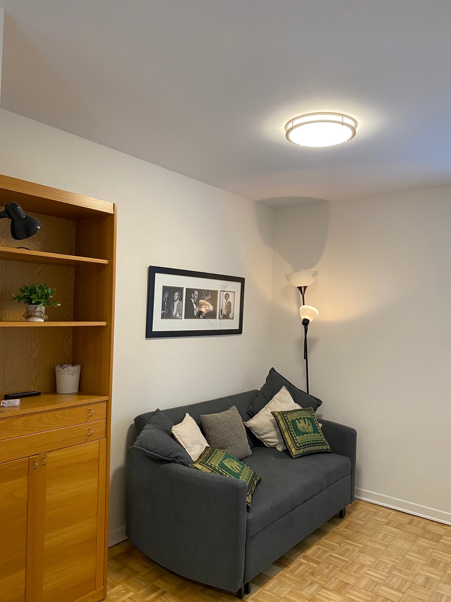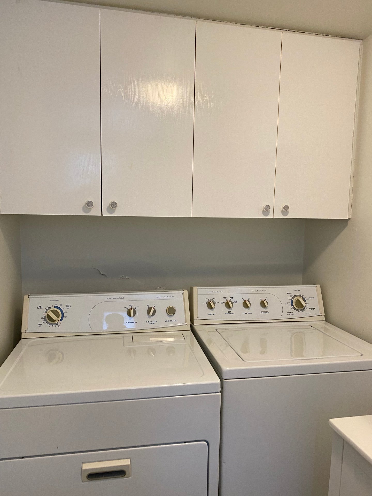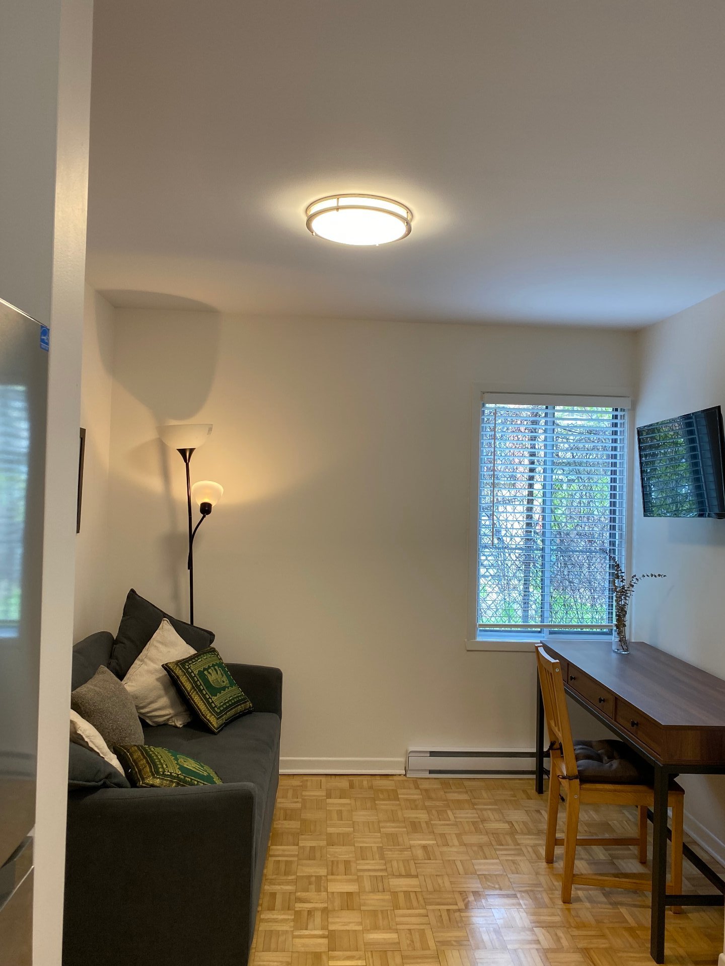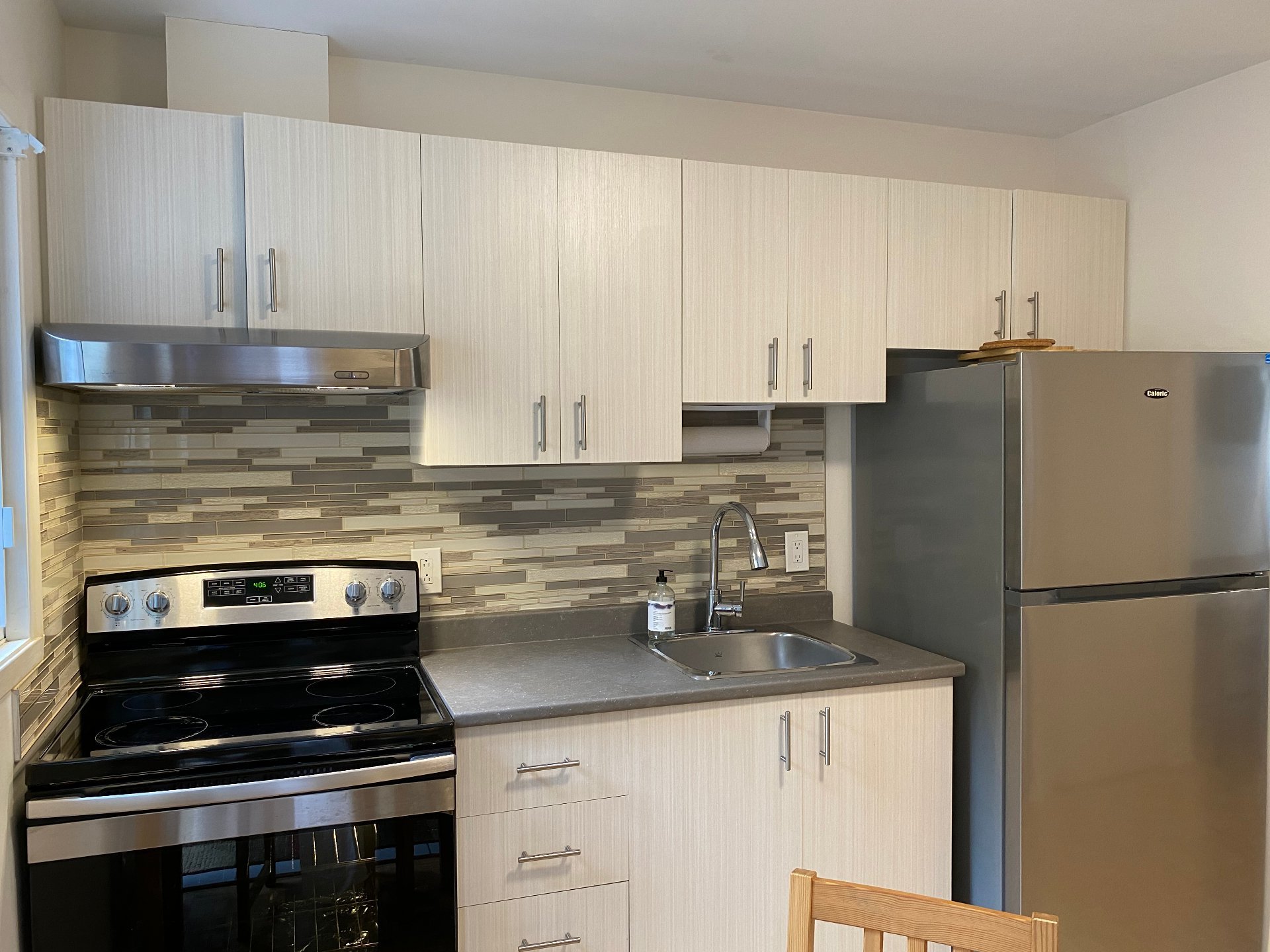 Tout meublé et fourni comprend: poêle, frigidaire, micro-ondes, laveuse sécheuse, sofa-lit, étagère, télévision, bureau, table de cuisine, tous les articles de cuisine, aspirateur, séchoir à cheveux, lit, 2 tables de chevet, bureau.